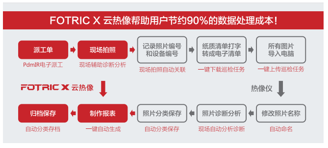 與熱像儀相比,F(xiàn)OTRIC X云熱像"慧"管理,基于PdmIR熱像數(shù)據(jù)管理系統(tǒng)會自動管理并整合設(shè)備臺賬、巡檢任務(wù)和巡檢數(shù)據(jù),能幫助用戶的工作效率提升十倍,幫助用戶節(jié)約90%的數(shù)據(jù)處理成本。