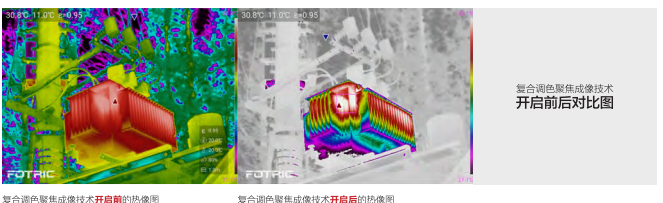FOTRIC自有的復(fù)合調(diào)色聚焦成像技術(shù),其出色的熱成像效果,非常適用于復(fù)雜場景中分析特定目標(biāo)的細微溫差,有利于現(xiàn)場快速得出正確的診斷結(jié)論(FOTRIC自有技術(shù))。