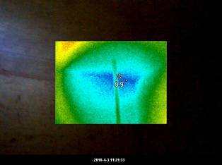 先將屋頂分為幾個(gè)區(qū)域,在現(xiàn)場(chǎng)操作只需兩名操作人員:一位在樓頂對(duì)待確認(rèn)區(qū)域澆熱水,還有一位在房間內(nèi)對(duì)滲漏部位進(jìn)行熱像跟蹤,當(dāng)滲漏區(qū)域被澆上熱水后,5分鐘內(nèi)在房間進(jìn)行熱像跟蹤的人員就可以發(fā)現(xiàn)至少0.7℃以上的溫升。